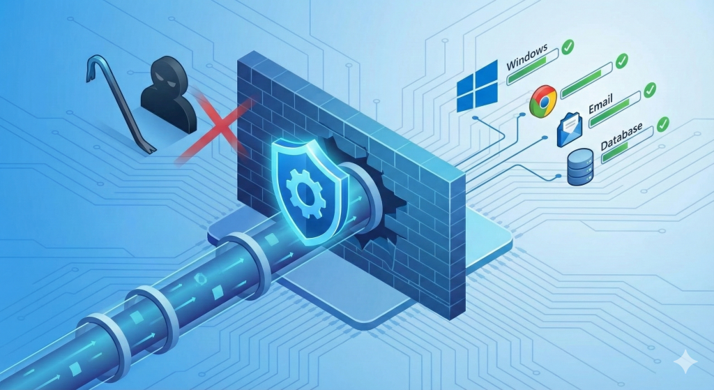 Los hackers entran por software desactualizado. Nosotros nos encargamos de mantener Windows y tus aplicaciones críticas actualizadas de forma automática y silenciosa, cerrando las puertas traseras de tu sistema.